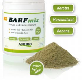 ANIBIO BARF mix bildet eine ausgewogene und artgerechte Ergänzung zur täglichen Rohfütterung. Durch die harmonische Zusammenstellung von Obst, Gemüse, Kräutern sowie weiteren wertvollen Ingredienzien aus der Natur wird die Futterration einfach und gesund komplettiert. Der Organismus erhält durch ANIBIO BARF mix wichtige Bestandteile in leicht verdaulicher Form.