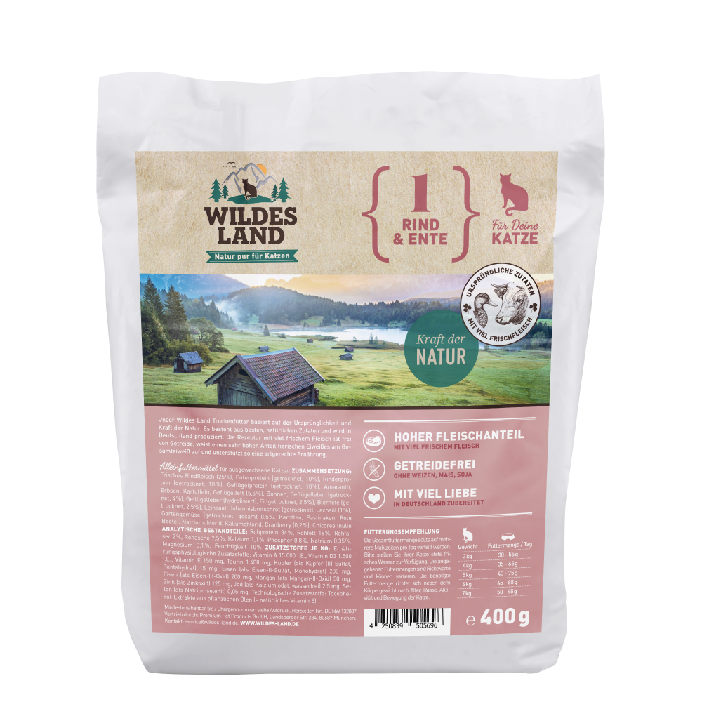 Mit einem extra hohen Fleischanteil von 67 % übertrifft sich Wildes Land mit dem Trockenfutter Classic Adult Rind & Ente wieder einmal selbst. Die schmackhafte Rezeptur auf viel frischem Rindfleisch und allseits beliebter Ente ist ein absolutes Highlight im Napf unserer Katzen. Verfeinert mit Erbsen liefert das Futter jede Menge leicht verdaulicher Proteine und Fette. Ausserdem enthält das Katzenfutter Amaranth als Kohlenhydratquelle und man verzichtet komplett auf minderwertige Getreidearten. Amaranth gilt als absolutes Power-Getreide enthält leicht verwertbarer Nähr- und Vitalstoffe und ist glutenfrei. Dank dem Verzicht von Farb-, Aroma- und Konservierungsstoffen sowie Zucker bekommt Ihr Liebling mit diesen leckeren Futter Natur pur als vollwertige Nahrung.
