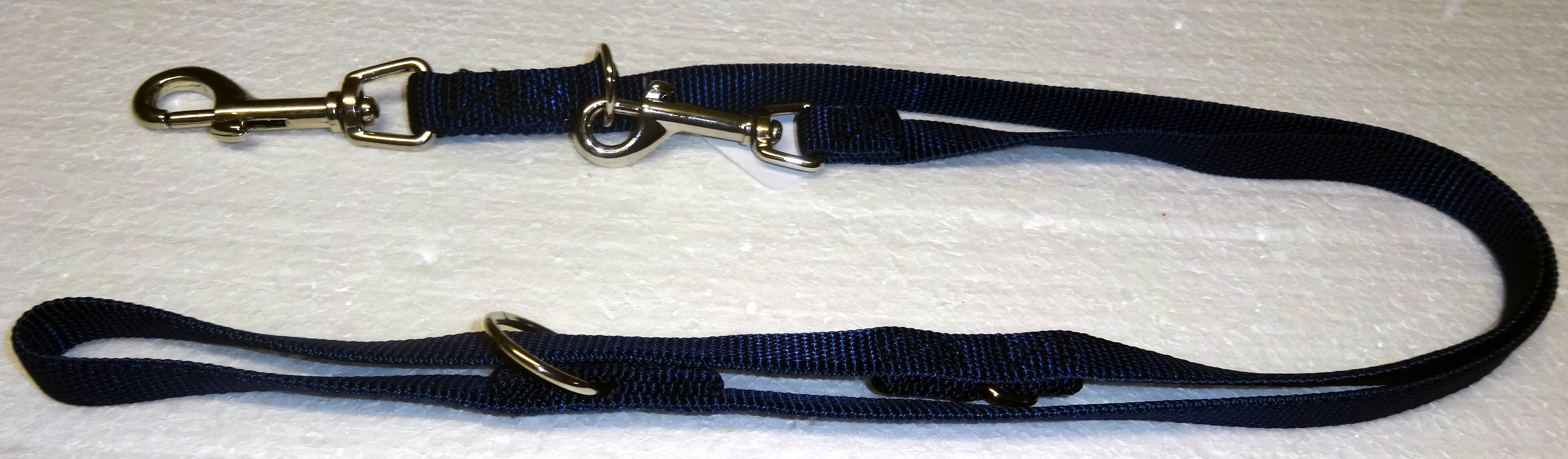 Die Führleine ist 3-fach verstellbar mit einem grossen und einen kleinen Karabinerhaken. Nylonschlauchband wird rund gewoben, dass heisst es hat keine Kanten. Dieses Band liegt sehr angenehm weich in der Hand.