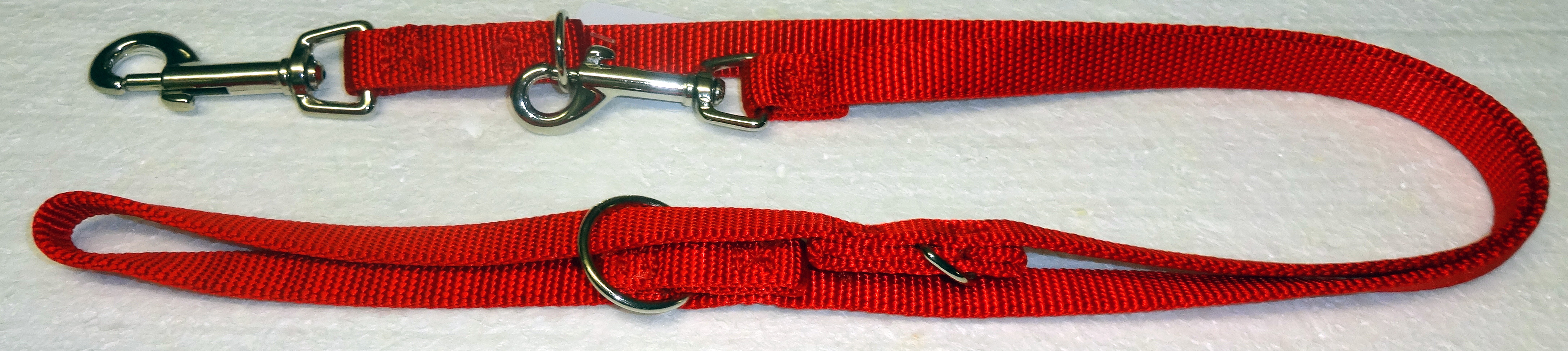 Die Führleine ist 3-fach verstellbar mit einem grossen und einen kleinen Karabinerhaken. Nylonschlauchband wird rund gewoben, dass heisst es hat keine Kanten. Dieses Band liegt sehr angenehm weich in der Hand.