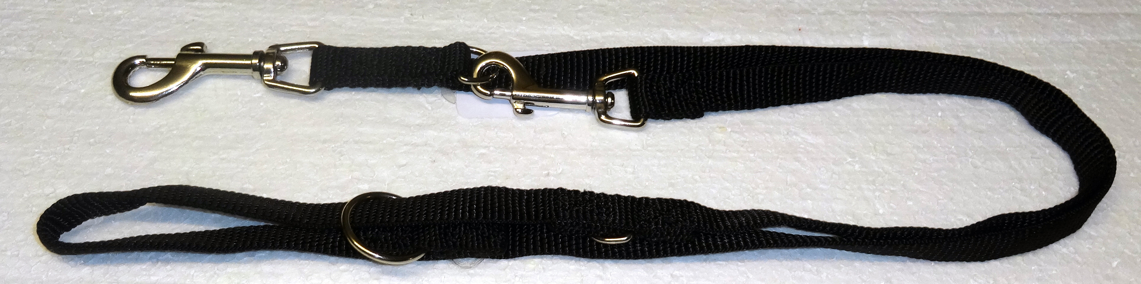 Die Führleine ist 3-fach verstellbar mit einem grossen und einen kleinen Karabinerhaken. Nylonschlauchband wird rund gewoben, dass heisst es hat keine Kanten. Dieses Band liegt sehr angenehm weich in der Hand.