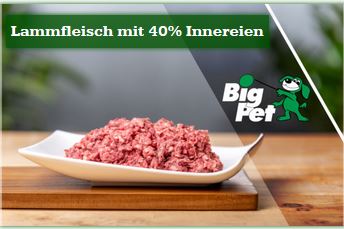 - Lammfleisch mit 40% Innereien, geschnetzelt, 60% Muskelfleisch, 20% Herz, 10% Lunge, 10% Leber