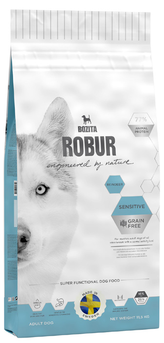 Zusammensetzung: Hühnchen 32% (getrocknetes Hühnchen 24%, frisches schwedisches Hühnchen* 8%), getrocknete Kartoffeln*, Erbsenstärke*, frisch zubereitetes Rentier* (8%), Knochenfett*, getrocknete Eier, hydrolysiertes Hühnchen, getrocknete Zuckerrübenschnitzel* (entzuckert), Mineralstoffe, Leinsamen, Lignozellulose*, Zichorien-Inulin* (FOS 0,63%), Hefe* (davon β-1,3/1,6-Glucane 0,05%), Glukosamin* (0,05%), Chonroitinsulfat* (0,004%)